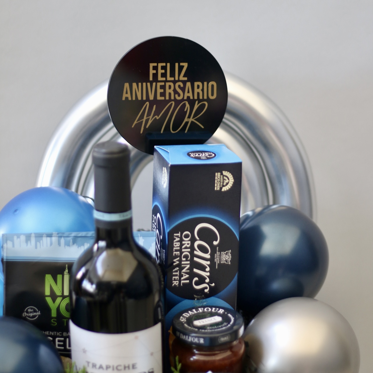Una combinación perfecta de sabores seleccionados para momentos excepcionales, acompañada de globos y aromáticos pinos, para una presentación sofisticada. Este regalo exclusivo incluye: