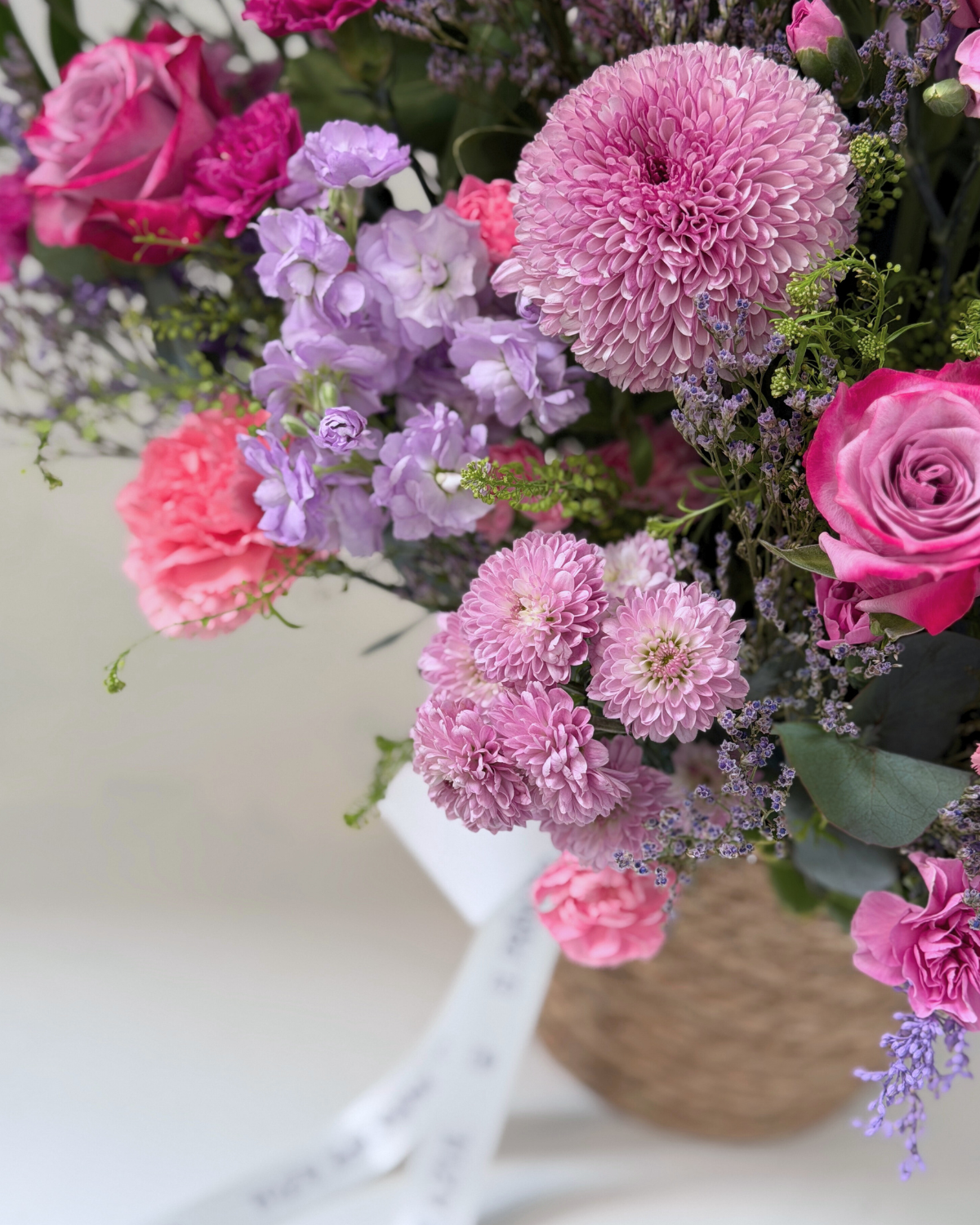 Rosas lilas acompañadas de una armoniosa combinación de flores seleccionadas, fusionando colores y texturas para crear un arreglo que resalta por su sofisticación. Un detalle refinado que convierte cada momento en una experiencia única.
