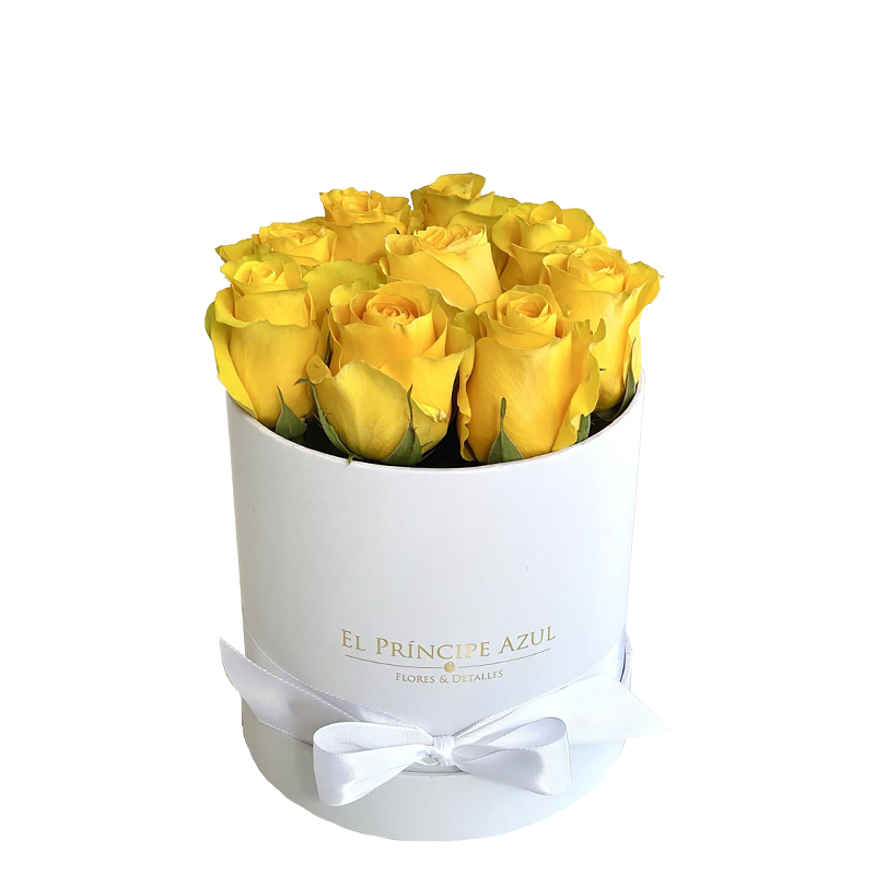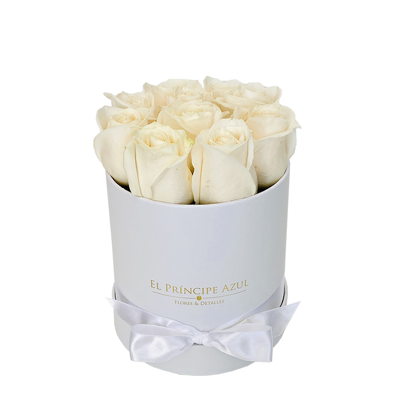 Elegante arreglo de 8 rosas en base redonda de color blanco.