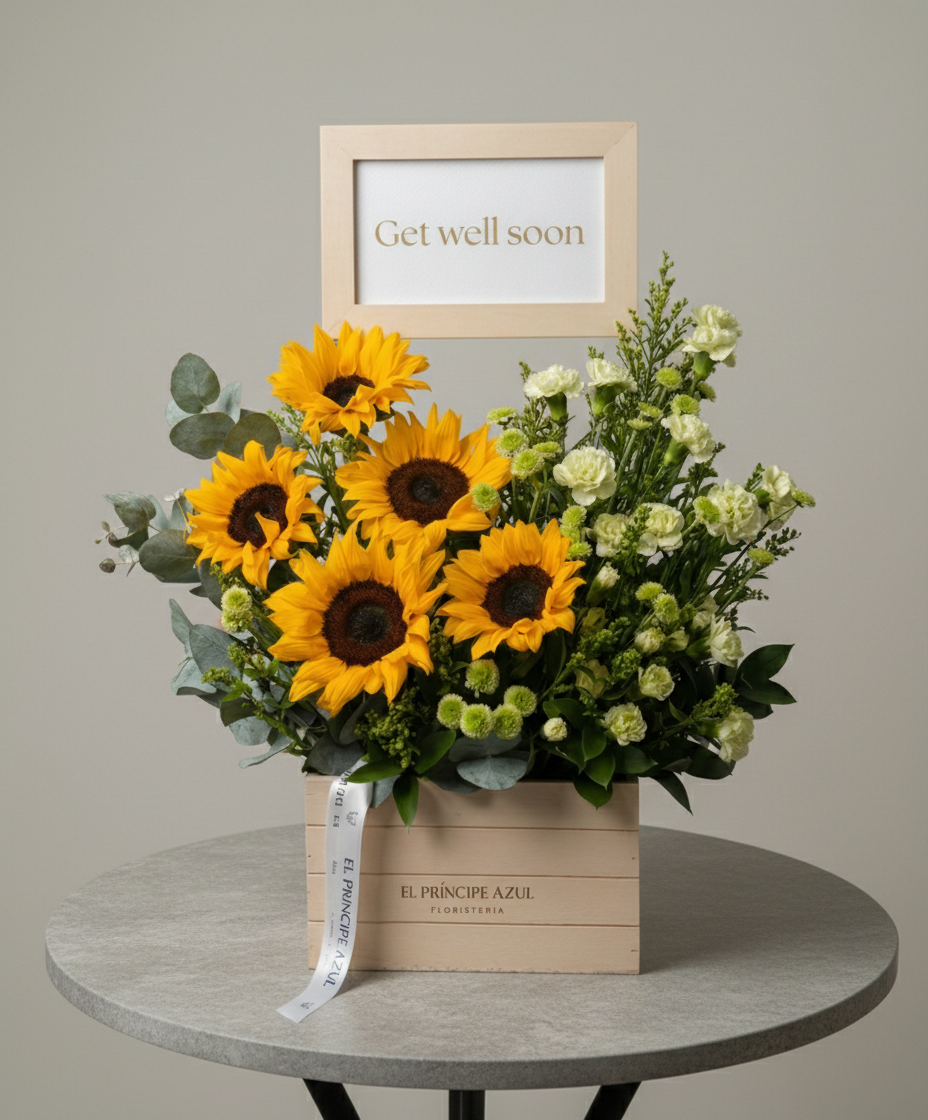 Vibrante arreglo de girasoles, acompañado de flores frescas y delicadas que realzan su belleza natural. Ideal para transmitir ánimo y buenos deseos, convirtiendo este gesto en una muestra de apoyo y esperanza.