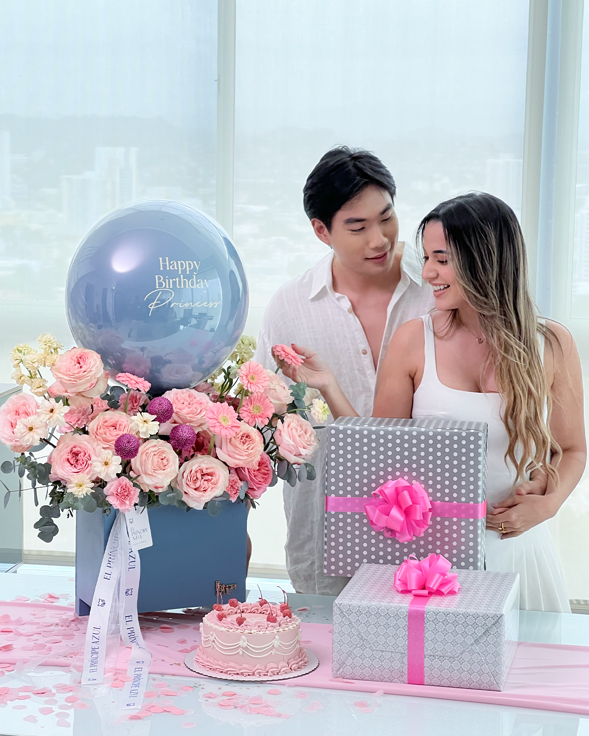 Imagine un arreglo que fusiona la elegancia de las rosas de jardín con el toque festivo de un globo personalizado.
